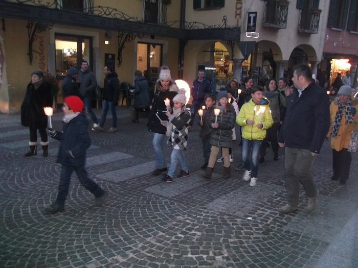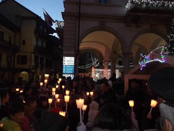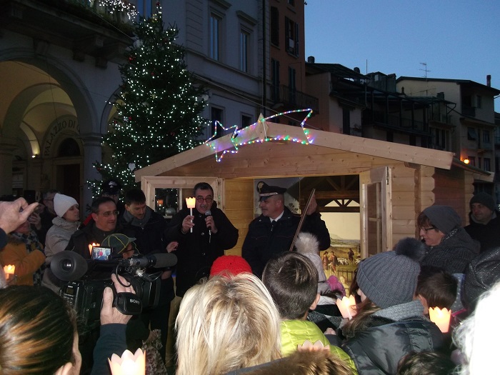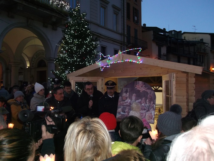 OMEGNA- 09-12-2017- Accompagnata dalla fiaccolata dei bambini del catechismo e benedetta da don Gianmario Lanfranchini, è avvenuta anche la tanto attesa inaugurazione del Presepe che riproduce l'Adorazione dei Magi (opera del Perugino). "Non potevamo- queste le parole dell'Assessore Mattia Corbetta- non riportare il Presepe in piazza e ringraziamo, per questo motivo, Sergio Viganò". Il primario di radiologia, un vero "mago" dei presepi ha ringraziato e spiegato ai presenti il valore dell'opera e ha quindi donato al Comandante dei Carabinieri, Paolo Puglisi, una riproduzione artistica della Natività. Il pomeriggio era iniziato con la castagnata degli Alpini ed è proseguito con il coro gospel "Black Inside".