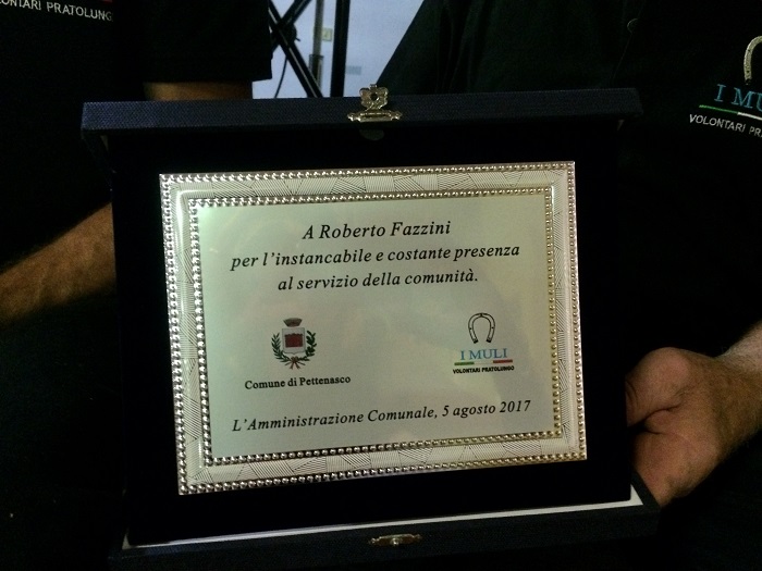 PETTENASCO- 07-08-2017- Sabato scorso, 5 agosto, durante la cena al Circolo di Pratolungo, in occasione della festa della Madonna della Neve, l'Amministrazione comunale ha voluto ringraziare i volontari di Pratolungo soprannominati "I Muli " che in più occasioni hanno dato il loro contributo per migliorare l'immagine della frazione e del paese in generale. In particolare uno de "I Muli", Roberto Fazzini, è stato premiato con una targa dal vice Sindaco nonchè assessore ai Lavori pubblici Mauro Cagnoli che trova nei volontari di Pratolungo un grande appoggio: per questo personalmente ha consegnato loro il giusto e meritato riconoscimento.
