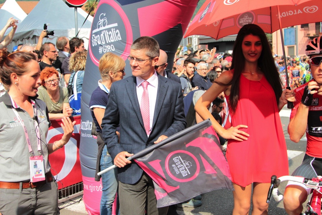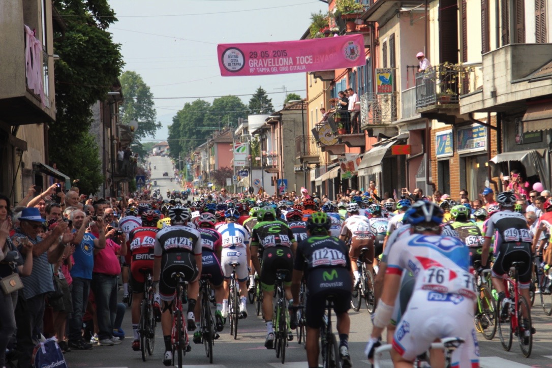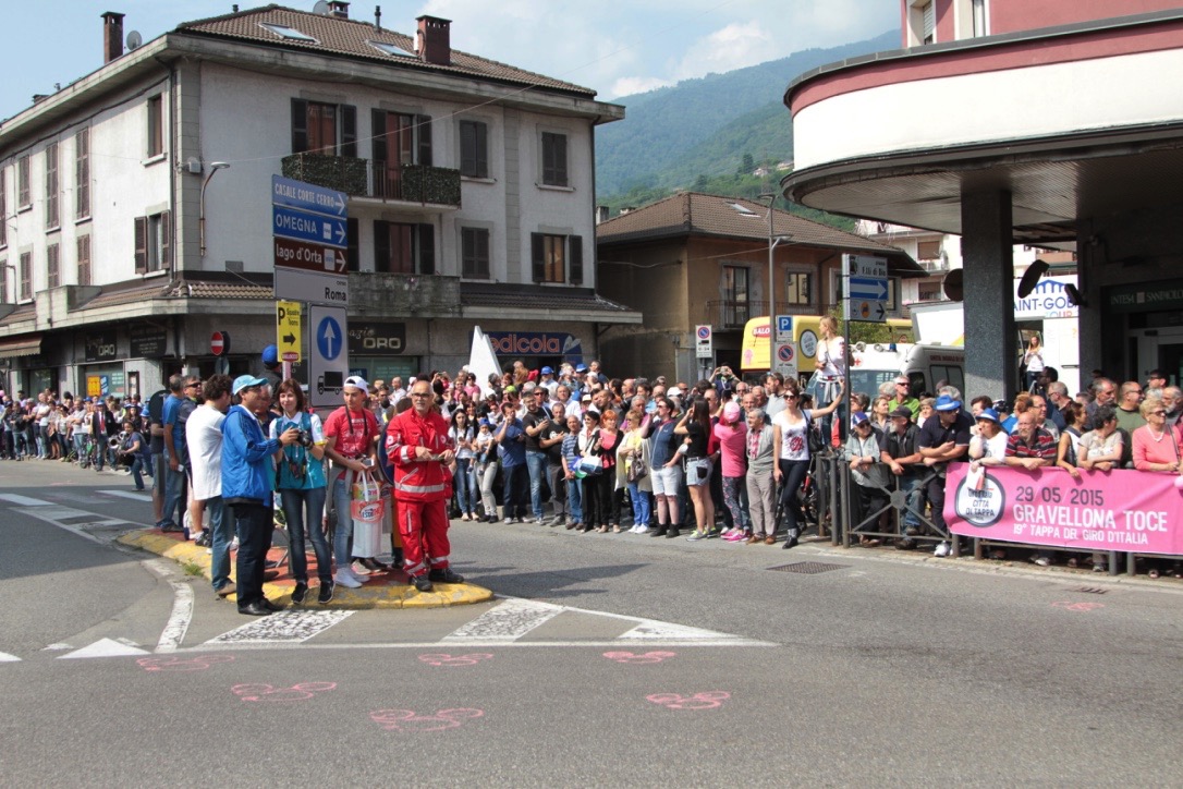 GRAVELLONA T. – 29.05.2015 – Dopo Verbania, Gravellona. È toccato al sindaco Giovanni Morandi, appassionato podista ma anche ciclista, dare il via ufficiale alla 19esima tappa del Giro d’Italia, la Gravellona Toce-Cervinia. Alle 10,55 da piazza Vittorio Veneto il gruppo è partito alla volta di Omegna (nel video un passaggio) lungo l’ex strada regionale del Lago d’Orta che lo condurrà verso il Biellese, il Canavese e la Valle d’Aosta. Prima c’è stato un bagno di folla per i corridori, accolti da un’ovazione alla pratica burocratica del foglio firma. Nonostante il giorno feriale anche Gravellona, come Verbania ieri, ha testimoniato l’affetto per la carovana rosa.