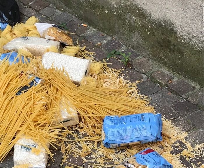 questa mattina ed è stato Luigi Songa, il portavoce di Fratelli d'Italia, ad avvisare le forze dell'ordine, nella fattispecie gli agenti della Polizia Municipale locale, in merito alla pasta e al riso abbandonati in via Carrobio nei pressi della Sala del Carrobio. Pacchi ancora integri, sia di pasta che di riso, ma anche cibo sfuso e sparpagliato nel vicolo che si trova a due passi dal centro. "Siamo di fronte- le parole di Songa- ad un vero e proprio spregio alimentare".