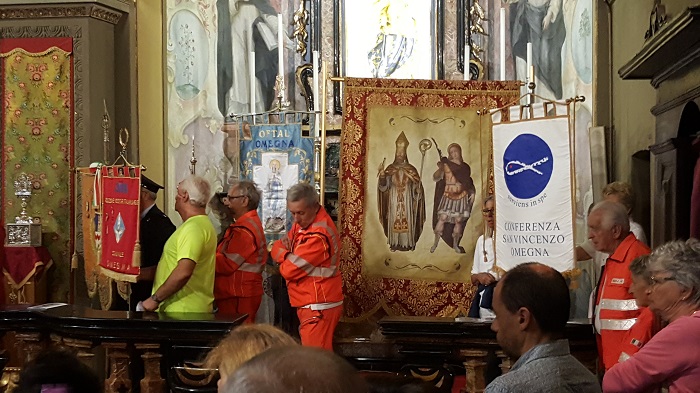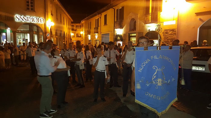 OMEGNA-26-08-2018- La centoquindicesima edizione dei festeggiamenti di San Vito sta volgendo al termine e dopo le sei serate in compagnia di artisti provenienti dal mondo dello spettacolo e della musica ed una di fuochi artificiali, nella serata di ieri, sabato 25 agosto, numerose centinaia di fedeli hanno partecipato alla messa solenne e alla successiva processione per le vie della città accompagnando l’urna con le reliquie del compatrono omegnese. La funzione è iniziata intorno alle 20.15 ed è stata presieduta dal vescovo di Savona-Noli Gero Marino, supportato dalla presenza di una dozzina di sacerdoti attivi nel territorio cusiano che non hanno mancato l’importante appuntamento religioso. Numerosi anche i chierichetti che hanno permesso il regolare svolgimento della celebrazione religiosa, contrastando con il bianco della loro tunica l’intenso rosso dei celebranti. Intanto, all’esterno, la Nuova Filarmonica Omegnese con il suo direttore Pasquale Ciocca Vasino ha aspettato i fedeli che hanno riempito la collegiata per guidarli con la forza della musica nel cuore della città, scandendo la cadenza della processione partita da piazza Beltrami e terminata di fronte al banco di beneficienza con la benedizione delle imbarcazioni, “affinché possano raggiungere il porto desiderato” ha invocato il parroco di Omegna don Gian Mario Lanfranchini. Presenti alla celebrazione le rappresentazione di diversi gruppi ed associazioni quali i Volontari del Soccorso, l’Oftal, la Conferenza San Vincenzo di Omegna e la sezione locale dell’Avis oltre alla confraternita del SS Sacramento e di santa Marta di Luzzogno ed i ragazzi scout che hanno dato il loro contributo sorreggendo le torce e gli altoparlanti per esempio. Fondamentale è stato l’aiuto dei volenterosi Alpini che hanno sostenuto l’urna di San Vito nel corso della processione. Chi non ha partecipato alla processione ma si è trovato condizionato nel muoversi a causa di essa, di certo non ha potuto fare a meno di contemplare il colpo d’occhio dato dalle centinaia di fiaccole che, con movimento lento, seguivano l’urna del santo accompagnate da canti e preghiere condivise tra tutti i fedeli.