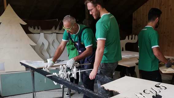 I volenterosi giovani del Gruppo sono affiancati da quelli che Falabella chiama i “maestri” che si occupano dei lavori più delicati e non adatti ai ragazzi: il fabbro Tony nella sua officina ingrassa gli ingranaggi dell’albero, salda e assembla, Giancarlo -il papà del Presepe- coordina le operazioni di verniciatura delle statue del Presepe, con una manualità meravigliosa realizza le nuove e con i giusti prodotti le tratta per renderle resistenti alle intemperie, Marco si occupa dei lavori edili, poi ancora ci sono Franco il meccanico, Paolo l’addetto alla posa della piattaforma in acqua e altri ancora…