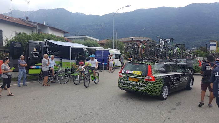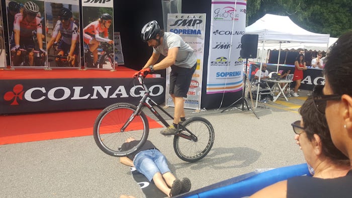 di Omegna ad un'ora dalla partenza presso piazzale Lodi. Nel clima festoso ed entusiasta, tra i numerosissimi curiosi accorsi in bicicletta è arrivata anche qualcuna delle cicliste che nella giornata di oggi correrà la quinta tappa del 29° Giro Rosa. Di fronte al palco allestito, i presenti hanno potuto prendere visione di uno spettacolo acrobatico di bicicletta a cura di Paolo Patrizi ed ha presenziato anche Giuseppe Rivolta, direttore del Giro.