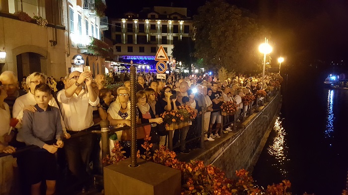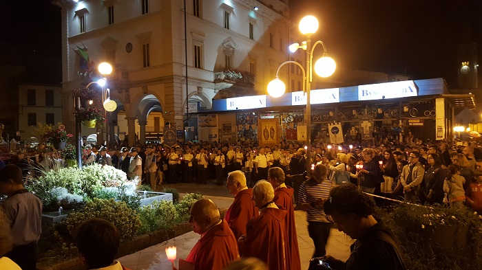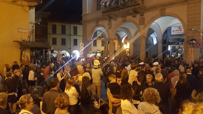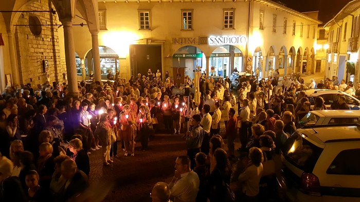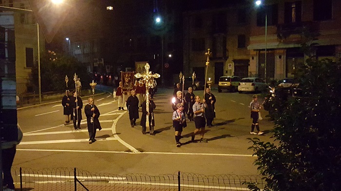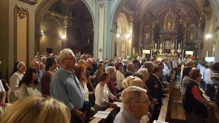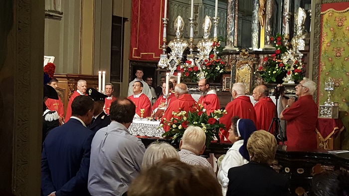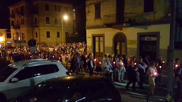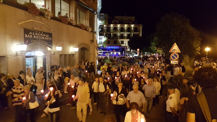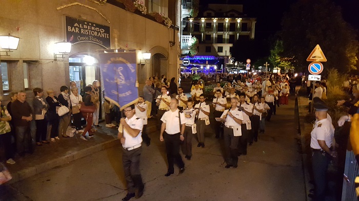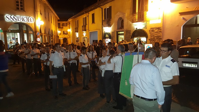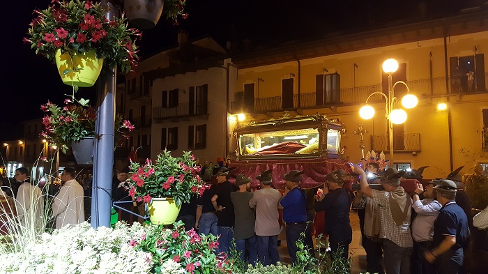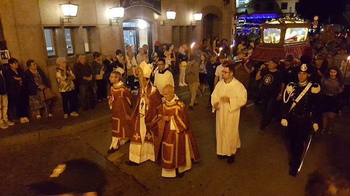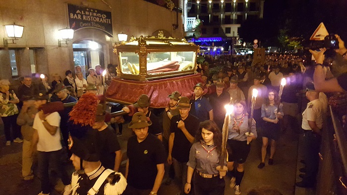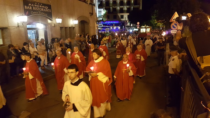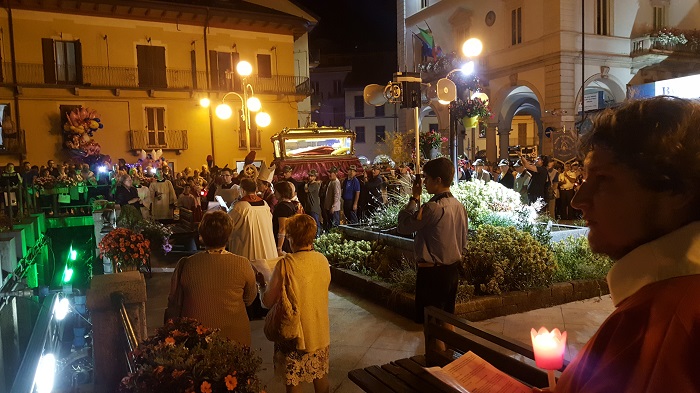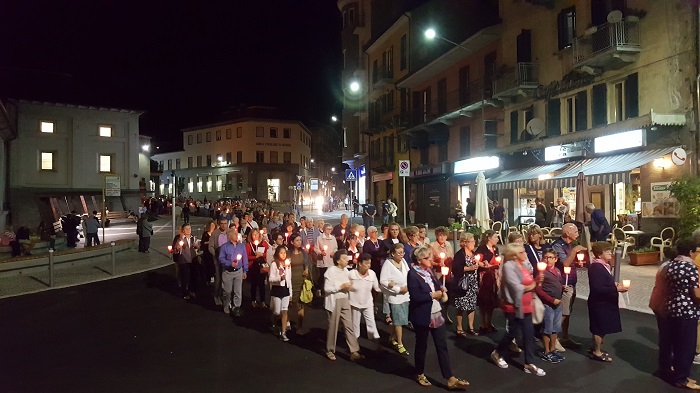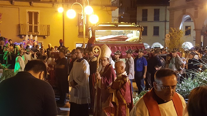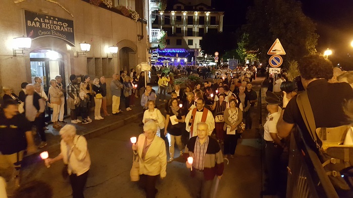 OMEGNA-26-08-2018- La centoquindicesima edizione dei festeggiamenti di San Vito sta volgendo al termine e dopo le sei serate in compagnia di artisti provenienti dal mondo dello spettacolo e della musica ed una di fuochi artificiali, nella serata di ieri, sabato 25 agosto, numerose centinaia di fedeli hanno partecipato alla messa solenne e alla successiva processione per le vie della città accompagnando l’urna con le reliquie del compatrono omegnese. La funzione è iniziata intorno alle 20.15 ed è stata presieduta dal vescovo di Savona-Noli Gero Marino, supportato dalla presenza di una dozzina di sacerdoti attivi nel territorio cusiano che non hanno mancato l’importante appuntamento religioso. Numerosi anche i chierichetti che hanno permesso il regolare svolgimento della celebrazione religiosa, contrastando con il bianco della loro tunica l’intenso rosso dei celebranti. Intanto, all’esterno, la Nuova Filarmonica Omegnese con il suo direttore Pasquale Ciocca Vasino ha aspettato i fedeli che hanno riempito la collegiata per guidarli con la forza della musica nel cuore della città, scandendo la cadenza della processione partita da piazza Beltrami e terminata di fronte al banco di beneficienza con la benedizione delle imbarcazioni, “affinché possano raggiungere il porto desiderato” ha invocato il parroco di Omegna don Gian Mario Lanfranchini. Presenti alla celebrazione le rappresentazione di diversi gruppi ed associazioni quali i Volontari del Soccorso, l’Oftal, la Conferenza San Vincenzo di Omegna e la sezione locale dell’Avis oltre alla confraternita del SS Sacramento e di santa Marta di Luzzogno ed i ragazzi scout che hanno dato il loro contributo sorreggendo le torce e gli altoparlanti per esempio. Fondamentale è stato l’aiuto dei volenterosi Alpini che hanno sostenuto l’urna di San Vito nel corso della processione. Chi non ha partecipato alla processione ma si è trovato condizionato nel muoversi a causa di essa, di certo non ha potuto fare a meno di contemplare il colpo d’occhio dato dalle centinaia di fiaccole che, con movimento lento, seguivano l’urna del santo accompagnate da canti e preghiere condivise tra tutti i fedeli.