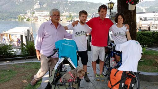 ORTA SAN GIULIO - 14-07-2019 - Un sogno che si avvera, un’avventura che inizia…così ieri, sabato 13 luglio, Arianna Casiraghi, Daniel Rayneau-Kirkhope e la loro cagnolina Zola sono partiti da Orta San Giulio per diffondere il loro messaggio: "Bicycles will save the world".