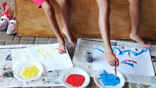 Ieri pomeriggio l’artista Emmanuela Cagnola ha tenuto un laboratorio durante il quale ha fatto vedere ai bambini come si fa a dipingere con le dita dei piedi ed è stato bellisimo guardare i piccoli cercare di tenere il pennello fra le dita dei loro piedini…