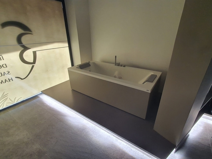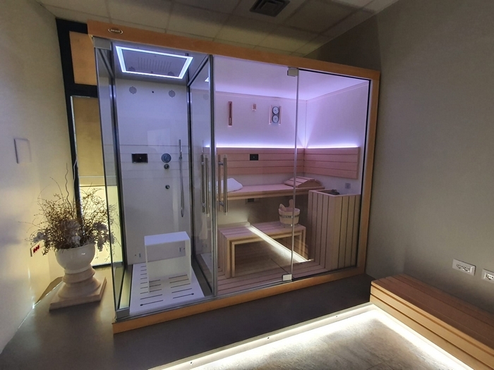 Un grande negozio dismesso al piano terra di un condominio di corso Liberazione è stato interamente rifatto “anche con l’obiettivo di dare nuovi posti di lavoro e di far lavorare le imprese locali”. All’ingresso la parete retrostante la reception, illuminata da un antico lampadario in gocce di cristallo, è arredata con una speciale carta da parati antibatterica su cui è stato stampato un motivo floreale orientaleggiante. Dalla hall si accede alla sala relax dove, accomodati su due poltrone ergonomiche tra luci soffuse, immagini e suoni d’atmosfera trasmessi da un maxischermo, i clienti attendono di entrare in sala massaggi, o nei locali che ospitano idromassaggio, hammam, sauna o doccia emozionale.