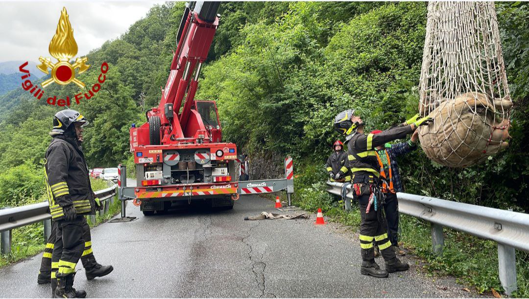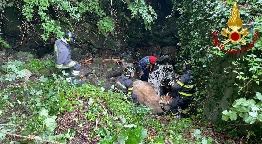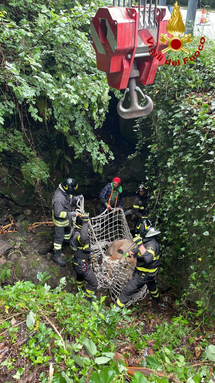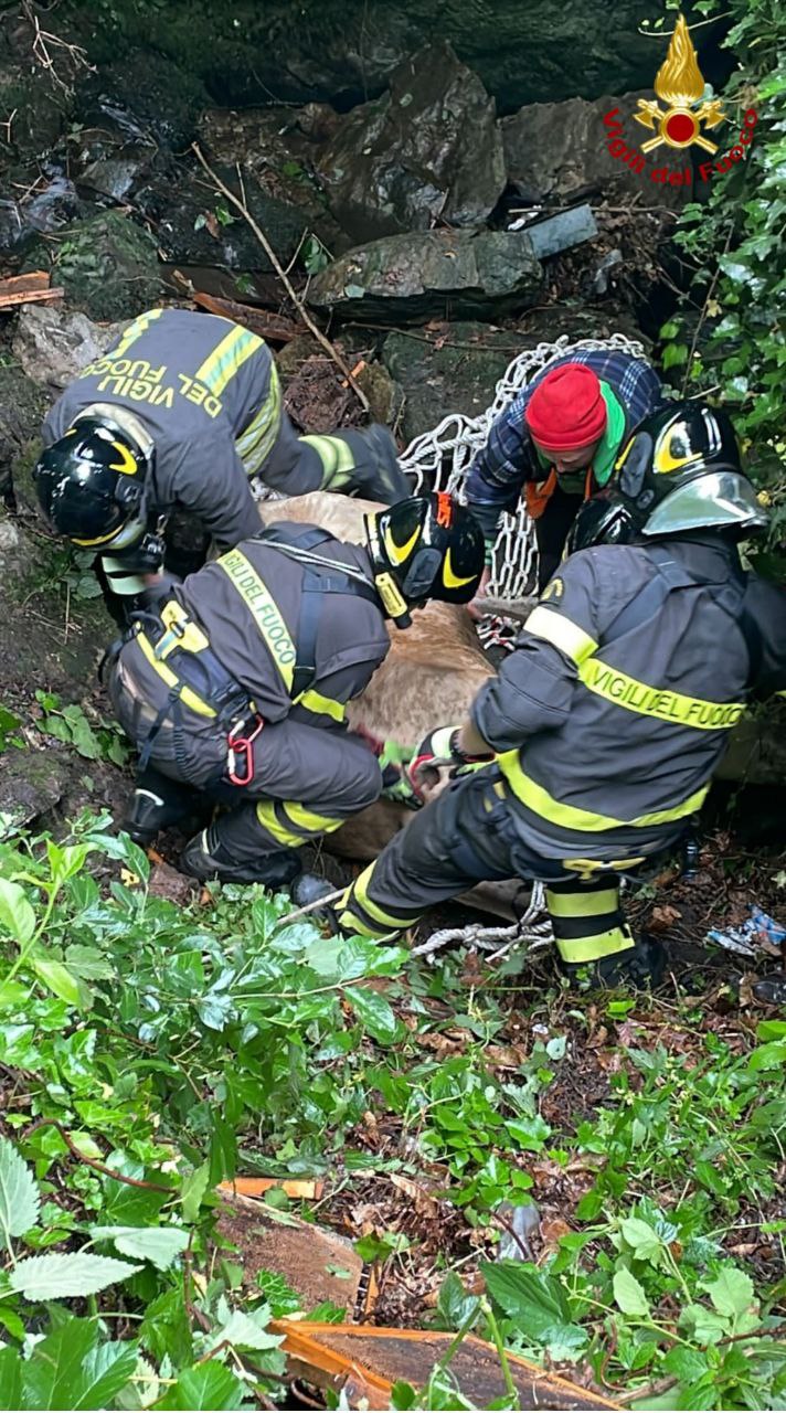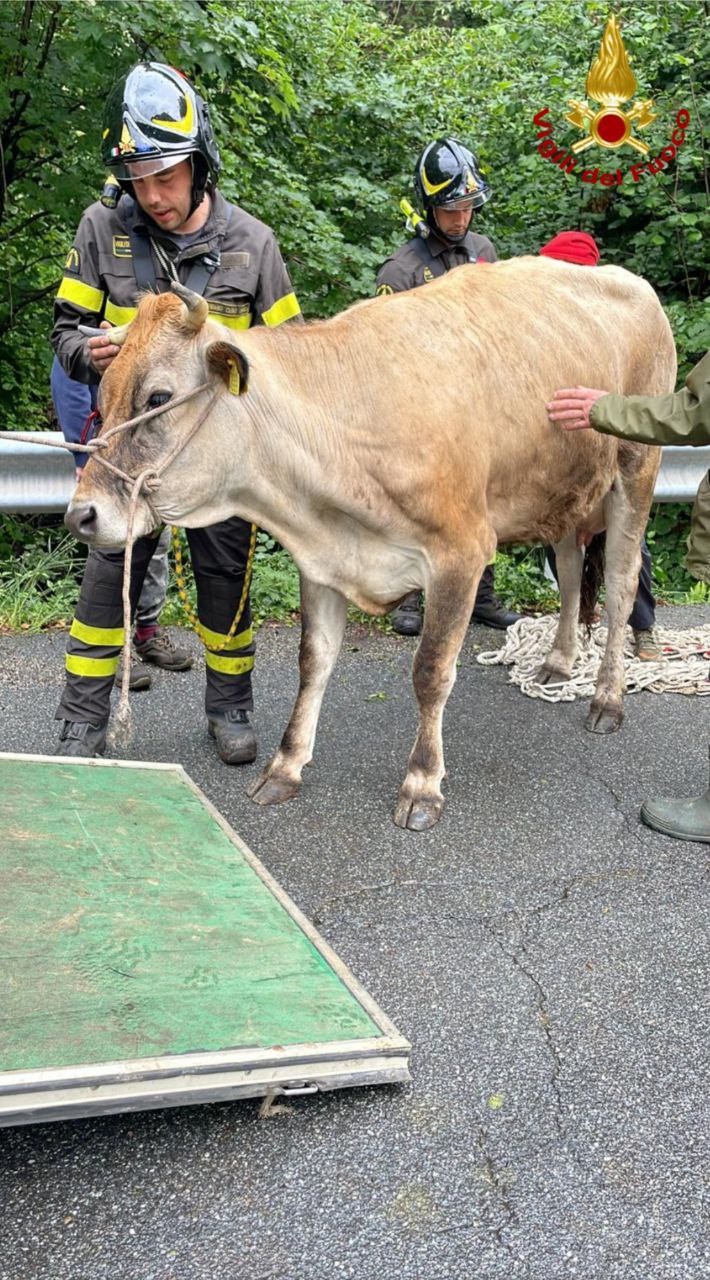 I Vigili del fuoco hanno dovuto richiedere l’intervento dell’autogru in supporto dal Comando di Verbania per recuperare l’animale evidentemente spaventato e non in grado di risalire autonomamente. Imbragato con apposite reti il bovino è stato sollevato, messo in sicurezza e trasportato a destinazione con specifico autocarro adibito al trasporto di bestiame.
